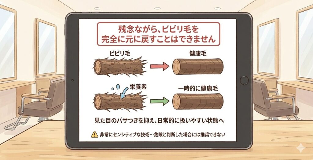 けして元の状態には戻りませんが、見た目のパサつきを抑え、日常的に扱いやすい状態へ持っていくことが可能です。